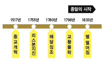 지금까지 공부하신 지진과 해 달 별의 징조들이 일어난 시기를 종합해 보면, 사람들이 말하는 종말 혹은 말세는 서기 1800년을 전후로 하여 시작되었고, 그 이후에 이 지구상에 사는 사람들은 인류 역사의 거의 마지막 부분에 살고 있다고 생각하면 맞을 것입니다. 이 내용을 대략 도표를 그려보면 한 눈에 이해를 할 수 있을 것 같습니다.