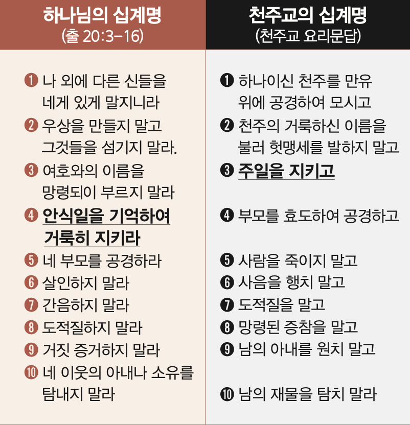 하나님의 법 십계명의 넷째 계명에 명시되어 있는 제칠일 안식일을 첫째 날인 일요일로 변경한 로마교회는 이제 하나님의 계명까지도 변경할 수밖에 없는 상황이 되었습니다.