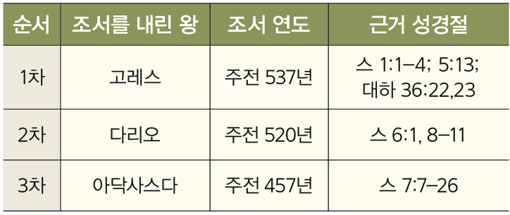 고레스의 조서 의하여 스룹바벨과 세스바살의 인도 하에 유대인 42,000 명이 귀환하여 성전 건축에 착수하였으나 사마리아인들의 방해로 완공하지 못했습니다. 그러므로 조서는 다니엘 9:25절에 해당되는 명령이 아닙니다.
